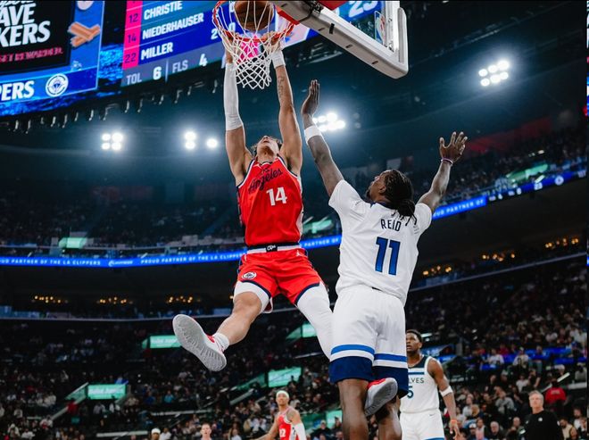 第一节比赛迪文琴佐命中三分,马瑟林投篮得分后麦丹扣篮得分,随后快船打出一波7-2,迪文琴佐命中三分后马瑟林突破得分,爱德华兹扣篮得分后兰德尔连得4分,麦丹扣篮得分后马瑟林罚球得分止血,戈贝尔罚球2中1后爱德华兹打板得分,快船打出一波8-2后道苏姆命中三分,接下来两队进攻对轰,第一节比赛结束森林狼领先2分。第二节比赛麦丹扣篮得分,米勒上篮得分后道苏姆抛投命中,米勒突破得分后两队频频打铁,后面戈贝尔上篮得分,里德罚球得分后琼斯也罚球得分,迪文琴佐抢断反击扣篮得分后邓恩罚球2中1,后续两队进攻停滞,迪文琴佐罚球得分后邓恩补篮得分,之后迪文琴佐、爱德华兹得分,半场比赛结束森林狼领先6分。